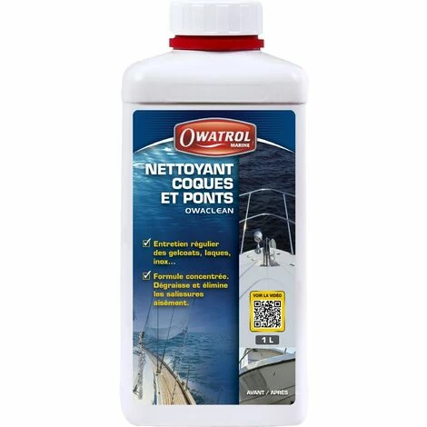 Owaclean est un nettoyant qui permet un entretien facile et de qualité à vos coques et ponts de bateaux. Ce nettoyant multi-fonction dégraisse et désincruste en profondeur pour un résultat impeccable. Sa formule ultra performante permet un entretien facile des gelcoats, laques et inox. Il protège vos surfaces et ne laisse aucune trace.
